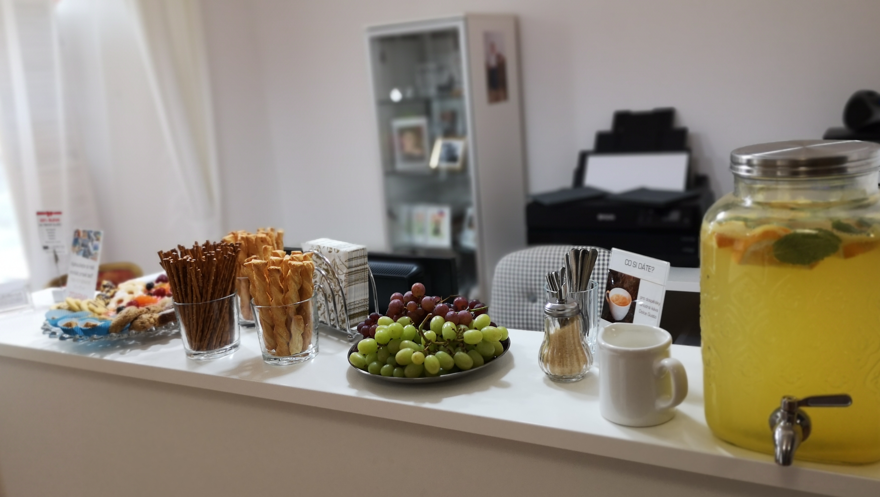 Ačkoliv se po obloze od rána honila tmavá mračna, dobrou náladu nám ani hrozba blížícího se deště vzít nemohla. Balónky vystavené před vchodovými dveřmi dávaly tušit oslavu – je to už rok, co jsme se přestěhovali do nových prostor na náměstí Arnošta z Pardubic v centru Českého Brodu. A k takovým narozeninám samozřejmě patří i správné pohoštění. Recepční pult jsme obložili dobrotami. Sladkosti jsme ten den vyzvedli čerstvé v nedaleké Kavárně U Madony. Nechybělo ani slané „zobání“ či ovoce a korbel s domácí limonádou. Už zbývá jen čekat, kdo dorazí.